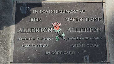 In loving memory of JOHN ALLERTON 13.4.17-23.5.89 Aged 72 years In God’s Care.  MARION LEONIE ALLERTON 6.6.20-26.12.94 Aged 74 years In God’s Care.                                     Parents Walter and Charlotte Elizabeth nee Wormack             Death Cert No. 1989/4225