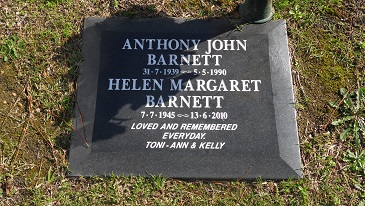(New Plaque 2012) ANTHONY JOHN BARNETT 31-7-1939-5-5-1990 HELEN MARGARET BARNETT 7-7-1945 – 1`3-6-2010 Loved and Remembered everyday. Toni-Ann & Kelly. |