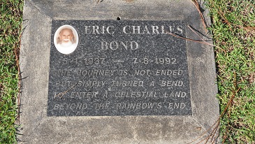 ERIC CHARLES BOND 5.1.1937-7.8.1992 The Journey is not ended, but simply turned a bend, to enter a celestial land, beyond the rainbow’s end. Death Cert No. 1992/7250 Parents : William Thomas and Winifred Martha SEAT IN NAME : In loving memory of my family WILLIAM THOMAS BOND 14.12.89. ERIC CHARLES BOND 7.8.92 WINIFRED MARTHA BOND 14.8.93. Donated by Beryl Amy Bond-Brown Zimbabwe. |