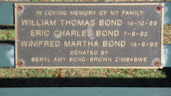 family of BERYL AMY BOND-BROWN Zimbabwe; SEAT IN NAME : In loving memory of my family WILLIAM THOMAS BOND 14.12.89. ERIC CHARLES BOND 7.8.92 WINIFRED MARTHA BOND 14.8.93. Donated by Beryl Amy Bond-Brown Zimbabwe. |