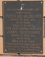 In loving memory of our father DOUGLAS BUCKHAM Born in the U.K. 8.10.1918 Died 7.7.1977 and our loving mother JOAN BUCKHAM Born in the U.K. 16.8.1919 died 26.8.1999 “Together now and for eternity” Love John, Shiela, Richard, Peter, Julie & Christine. |