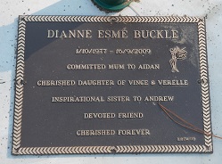 DIANNE ESME BUCKLE 1/10/1977 - 16/9/2009 Committed Mum to Aiden Cherished daughter of Vince and Verelle Inspirational Sister to Andrew devoted friend cherished forever. |