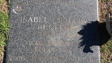 May Jesus I love thee BUGLER ISABEL CECELIA 28.9.1919-12.120.00  Dearly loved wife Mum & Nana.  Resting in the everlasting arms   (Salvation Army Insignia)