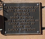 In loving memory of MEL (MELVA) LEE BURDEN Born 29.10.54 Died 14.10.99 Aged 44  Sadly missed by Shane, Ben, Laura and Denis.