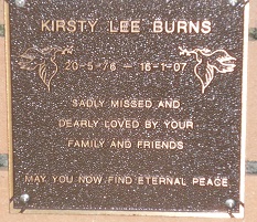 KIRSTY LEE BURNS 20-5-76-16-1-07 Sadly missed and dearly loved by your family and friends May you now find eternal peace. |