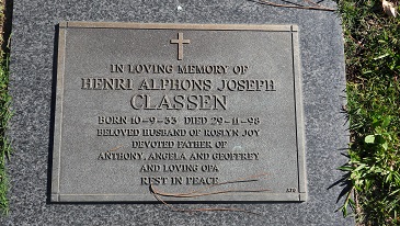 In loving memory of HENRI ALPHONS JOSEPH CLASSEN.  Born 10.9.33 Died 29.11.98.  Beloved husband of Roslyn Joy, Devoted father of Anthony, Angela and Geoffrey, and loving opa;. Rest in Peace.