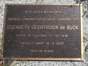 Here rests my beloved Mother, Grandmother & Great Grandmother ELIZABETH GEERTRUIDA deBUCK Born in Holland 27.10.1918- Passed away 18.3.2017 Rest in Peace. |