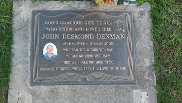 God’s Gracious gift to all who knew and loved him JOHN DESMOND DENMAN 12.10.1964-28.12.2005 We hear the words you say “Girls go seize the day” This we shall promise to do because for ever we’ll feel the love from you. |