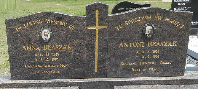 TU SPOCZYWA SW PAMIECI ANTONI BLASZAK 11.6.1911 – 14.9.91. KOCHANY DZIEDEK I OJCIEC Rest in Peace. Death Cert No. 1991/8137 Parents : Ignacy and Palagia nee Stanny. |