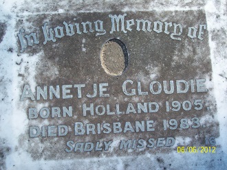 In loving memory of ANNETJE GLOUDIE Born Holland 1905. Died Brisbane 1983. Sadly missed. Parents Arie & Trijntje Death Cert No. 1983/5525. |