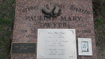 31/01/1959- 7/12/2004 (Pauline Mary Dwyer Sister & Nana 28.11.1929- 24.4.1995 Troy Paul Lennon Dwyer Son & Brother 02/05/1969-23/10/2003 Vicki Ann Goodman Mother, Sister & Nana 31/1/1959-17/12/2004) |