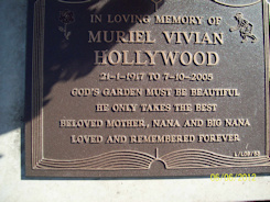 In loving memory of MURIEL VIVIAN HOLLYWOOD 21-1-1917 to 7-10-2005 God’s Garden must be beautiful He only takes the best beloved mother, nana and Big nana loved and remembered for ever |