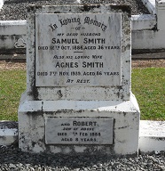 In loving memory of my dear Husband SAMUEL SMITH Died 12 Oct 1886. Aged 36 years. Also his loving wife AGNES SMITH died 7th November 1939 aged 86 years. At Rest and ROBERT son of above Died 9th Feb 1888 Aged 8 years. Death Cert No. 1886/2263 Parents Samuel & Mary Marion nee Stone Wife Agnes nee Jack |