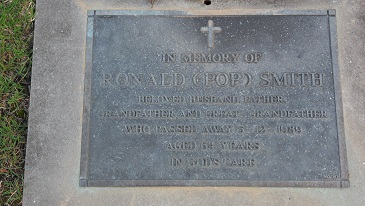 In Memory of RONALD (POP) SMITH Beloved husband father Grandfather & Great Grandfather who passed away 5.12.1989Aged 64 years. In God’s Care. Death Cert No. 1990/27 Parents : Bernard James and Alice Edna nee Wells. |