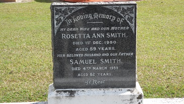 In loving memory of my dear wife and our mother ROSETTA ANN SMITH Died 1st Dec 1950 Aged 59 years. Her beloved husband and our father SAMUEL SMITH Died 4th March 1959 aged 82 years. At Rest. Death Cert No. 1959/b30499 Wife Rosetta Ann nee Selvage Parents : Samuel and Agnes nee Jack |