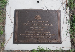 In loving memory of NOEL ARTHUR HALL 27.11.1919-3.10.2009 aged 89 years much loved father of Sheryl loving Grandfather of Catherine and Daniel loved and remembered always Photo of Also when there was only a marker Parents : Thomas Norton and Violet Eliza nee Jackson. |