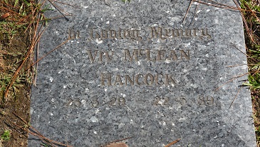 In loving memory VIV McLEAN HANCOCK 23.3.29 – 22.5.89. Death Cert No. 1989/4082 Parents : Vivian Edgar Mary McLean nee Murray |