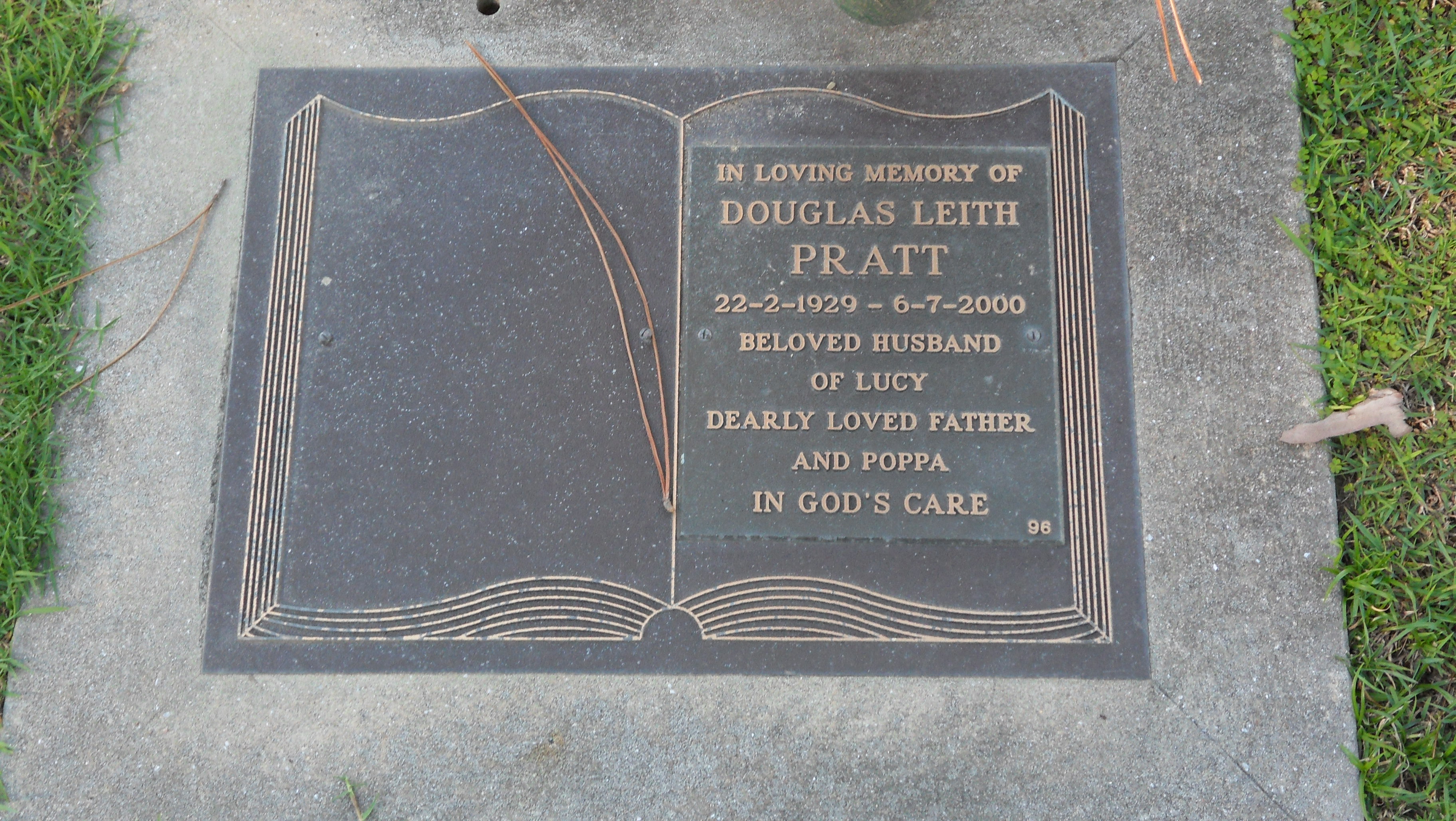 In loving memory of DOUGLAS LEITH PRATT 22.2.1929 – 06.07.2000 Beloved Husband of Lucy Dearly loved father & Poppa in God’s Care. |