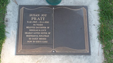 SUSAN JOY PRATT 3-12-1965-13-1-2010 44 years Beloved daughter of Douglas & Lucy Dearly loved Sister of Brendan & Jonathan so sadly missed Now in God’s Care. |