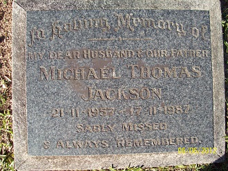 In loving memory of My dear Husband & our Father MICHAEL THOMAS JACKSON 21.11.1957-17.11.87 Sadly missed and always remembered. Cannot find death registered in Qld. |