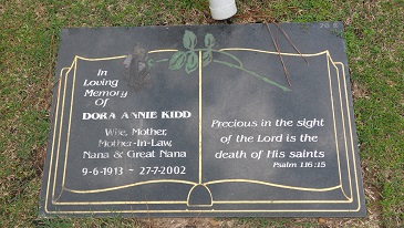 In loving memory of DORA ANNIE KIDD Wife Mother Mother in Law Nana & Great Nana 9.6.1913-27.7.2002 Precious the sight of the Lord is the death of his saints Psalm 116:15.