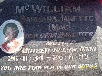 McWILLIAM BARBARA JANETTE (Mac) Our dear daughter, mother, mother-in-law, nana 26.11.34-26.6.85 You are forever in our hearts. (Photo) Death Cert No. 1985/5357 Parents Charles Panos and Vera nee Towe |