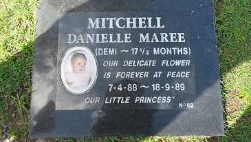 MITCHELL DANIELLE MAREE (Demi 17 ½ months) Our delicate flower is forever at peace 7.4.88-18.9.89 “Our little Princess”. (17 ½ Months) Death Cert No. 1989/8747 Parents : Brian Russell and Louise Janet nee McWilliam |