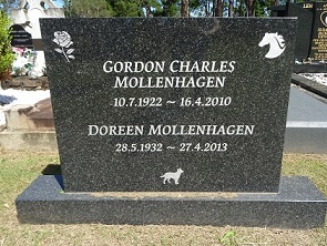 MOLLENHAGEN G C & D. GORDON CHARLES MOLLENHAGEN 10-7-1922 – 16-4-2010 DOREEN MOLLENHAGEN 28-5-1932 – 27-4-2013 |