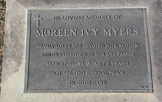 In loving memory of MOREEN IVY MYERS Dearly loved and devoted Wife, Mother and Grandmother of Bob and family. Died 27.11.89 Aged 72 years. May she find Eternal peace. In God’s Care. Death Cert No. 1989/864 Parents : George Wilfred Turner and Mabel nee Livingstone |