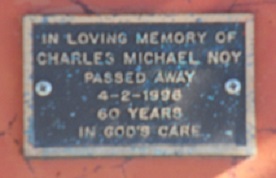 In loving memory of CHARLES MICHAEL NOY passed away 4.2.1996 60 years. In God’s Care. Wife : Pamela Margaret nee Storey. Parents Edward Charles and Jean Louise nee McKenzie |