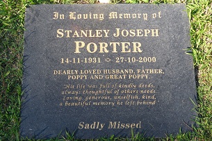 In loving memory STANLEY JOSEPH PORTER 14.11.1931-27.10.2000 Dearly loved Husband & Father Poppy & Great Poppy His life was full of kindly deeds always thoughtful of others needs loving generous unselfish. Kind & beautiful memory he left behind Sadly missed. |