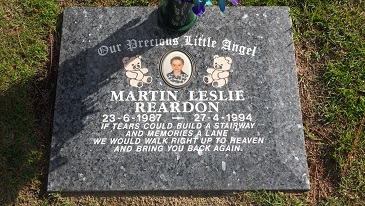 Our precious little Angel MARTIN LESLIE REARDON. If tears could build a stairway and memories a lane we would walk right up to heaven and bring you back again. |