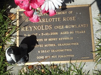 In loving Memory of Charlotte Rose Reynolds (nee Rowland) 5.4.1917-5.10.2006 aged 89 years Wife of Henry Reynolds Loved Mother, Grandmother, & Great Grandmother. Gone but not forgotten. |