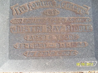 In loving Memory of our darling son & brother JUSTIN RAY RIDDLE Aged 6 years 22.1.1981-9.1.1988. In God’s Care Parents : Garry Paul Riddle and Lorraine Heather nee Jelleff Death Cert No. 1988/552 |