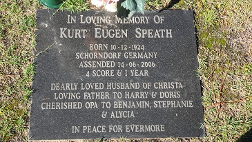 IN loving Memory of SPEATH KURT EUGEN born 10.12.1924 Schorndorf Germany assended 14.6.2006. 4 score & 1 year Dearly loved husband of Crista Loving father to Harry & Doris cherished OPA to Benjamin Stephanie & Alycia in peace for evermore. |