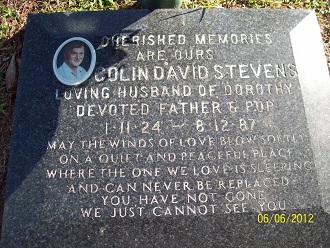 Cherished memories are ours COLIN DAVID STEVENS Devoted Husband of Dorothy Father and Pop 1.11.24-8.12.87 May the winds of love blow softly on a quiet and peaceful place where the one we love is sleeping and can never be replaced. You have not gone. We just cannot see you. Death Cert No. 1987/9871 Parents : Walter William and Esther Maud nee Christian |