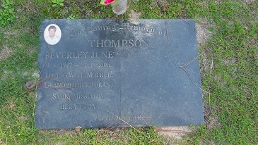 In loving memory of (photo) THOMPSON BEVERLY JUNE 9.4.1947-21.1.2006 loving wife mother grandmother (Gran) sadly missed by her family In God’s Care. |