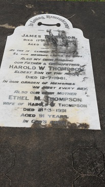 In loving remberance of JAMES THOMPSON died 17th July 1900. Aged 29 years. As the ivy clings to the oak, so our memory clings to thee. Also my dear Husband our Father and Grandfather HAROLD W THOMPSON Eldest son of the above died 12.7.1961 in our Garden of Memories we meet everyday. Also our dear Mother ETHEL M THOMSPON wife of HAROLD W THOMPSON Died 21.3.1991 aged 91 in God’s Care. |