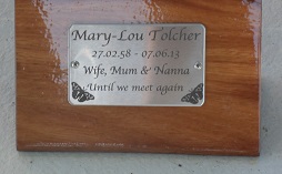 MARY LOU TOLCHER 27.02.1958-07-06.2013 Wife Mum and Nanna Until we meet again on wooden plaque under chair of Nyle Schull.