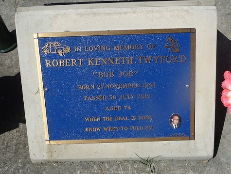 In Loving Memory ROBERT KENNETH TWYFORD “Bob Job” Born 21st Nov 1944 Passed 30th July 2019 Aged 74 When the deal is done, know when to fold arm Parents : Kempton Walter Twyford and Phyllis Jane nee Parr |