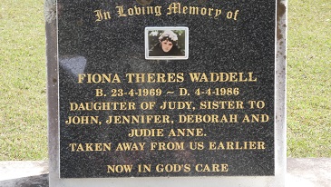 In loving memory of FIONA THERES WADDELL b23.4.1969-D4.4.1986 Daughter of Judy, sister to John, Jennifer, Deborah and Judie Anne;  Taken Away from us earlier now in God’s Care.                             Death Cert No. 1986/2937    Parents : Terrence Schiumerlich and Alice Emma nee Hollingsworth.