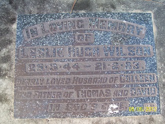 In loving Memory of LESLIE HUGH WILSON 25.3.44-21.2.83 Dearly loved husband of Colleen and father of Thomas, David. In God’s Care. Death Cert No. 1983/1605 Parents : Cyril Archibald Wilson and Annie Agnes Brown nee Walker. |