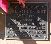 In loving memory of WILLIAM HERBERT WILSON Sadly missed by his son & daughter and their families Passed away 11.12.98 Aged 76 years. Birth Cert No. 1922/c10662 Parents : William Herbert Wilson and Alice Ellen nee Allwood. |