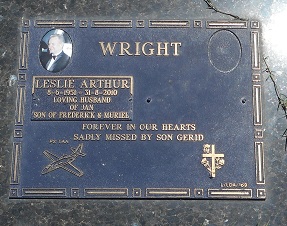 WRIGHT Leslie Arthur 8.6.1951-31.8.2010 Loving Husband of Jan son of Frederick & Muriel Forever in our hearts sadly missed by son Gerid. ( P2 TAA Plane) |