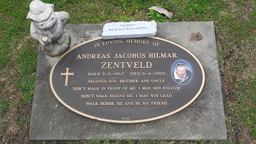 In loving memory of ANDREWA JACOBUS HILMAR ZENTVELD born 3.5.1967 Died 8.4.2002 beloved son brother and Uncle Don’t walk in front of me, I may not follow. Don’t walk behind me, I may not lead. Walk beside me & be my friend. |