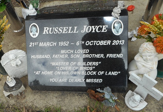 RUSSELL JOYCE 21st March 1952 – 6th October 2013 Much loved Husband, Father, Son, Brother, Friend. “Master of Builders: “Lover of Birds” “At Home on his own block of land” You are dearly missed. |