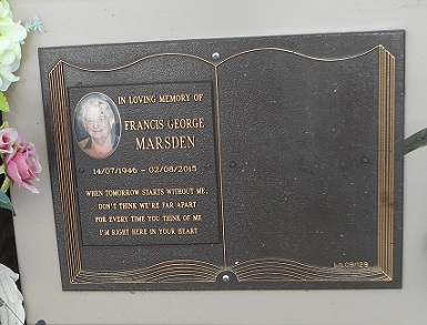 In loving Memory of FRANCIS GEORGE MARSDEN 14/07/1946-02/08/2015 When Tomorrow starts without me, Don’t think we’re far apart. For every time you think of me, I’m right here in your heart. |