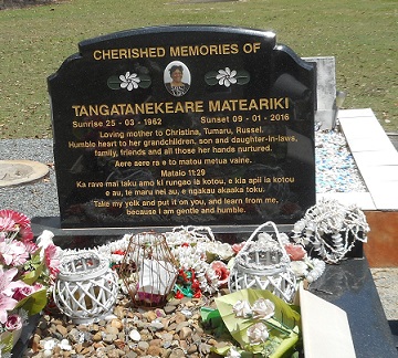 Cherished Memories of TANGATANEKEARE MATEARIKI Sunrise25-03-1962 Sunset 09-01-2016 Loving mother to Christina, Tumaru, Russell. Humble heart to her grandchildren, son and daughter-in-laws, family friends and all those her hands nurtured. Aere aere ra e to matou metua vaine. Mataio 11:29 Ka rave mai taku amo ki rungao ia kotou, e kia apii ia kotou e au, to maru nei au, e ngakau akaaka toku. Take my yolk and put it on you, and learn from me, because I am gentle and humble. |