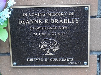 In loving Memory of DEANNE E BRADLEY In God’s Care now 24.1.66-23.4.17 For Ever in our Hearts.