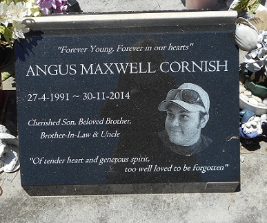 “Forever Young, Forever in our hearts” ANGUS MAXWELL CORNISH 27.4.1991-30.11.2014 /Cherished Son, Beloved Brother, Brother-in-Law & Uncle. “Of tender heart and generous spirit, too well loved to be forgotten.” |
